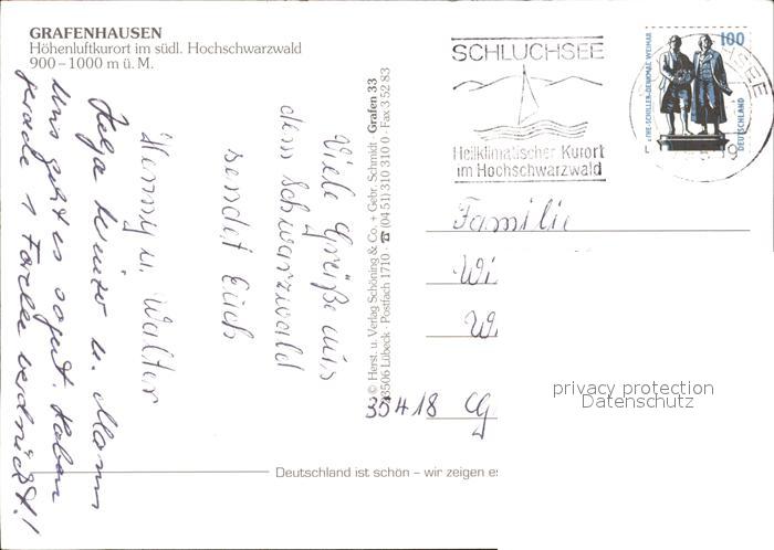72542898 alte Postkarte Grafenhausen Schwarzwald Narrenbrunnen Sankt Laurentiuskapelle Schluechtmuehle Tannenmuehle Ortsansicht postalisch gelaufen Erhaltung siehe scans [AndreD76 kv012box] KatCode: 11110008337039