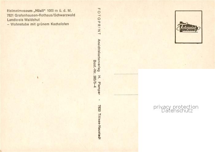 73081819 Grafenhausen Schwarzwald Rothaus Heimatmuseum Huesli Ofenecke mit Spinnrad postalisch nicht gelaufen Erhaltung siehe scans [LiesaD40] KatCode: 11110008337039