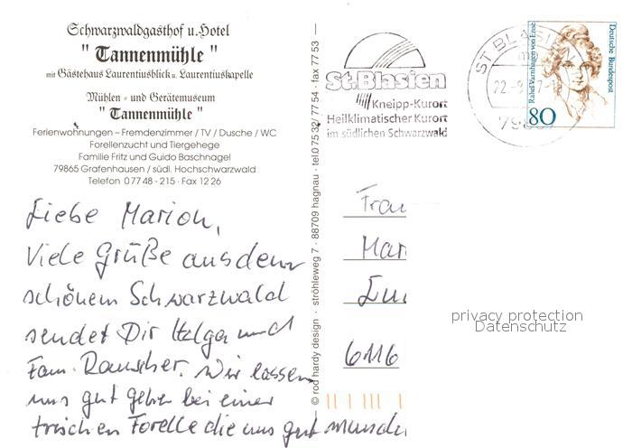 73225527 alte Postkarte Grafenhausen Schwarzwald Schwarzwaldgasthof Hotel Tannenmuehle postalisch gelaufen Erhaltung siehe scans [FriedD77] KatCode: 11110008337039