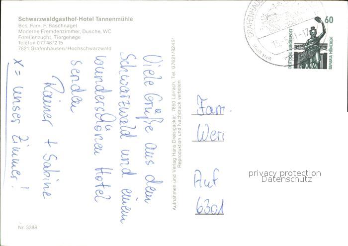 72492324 alte Postkarte Grafenhausen Schwarzwald Schwarzwaldgasthof Hotel Tannenmuehle postalisch gelaufen Erhaltung siehe scans KatCode: 11110008337039