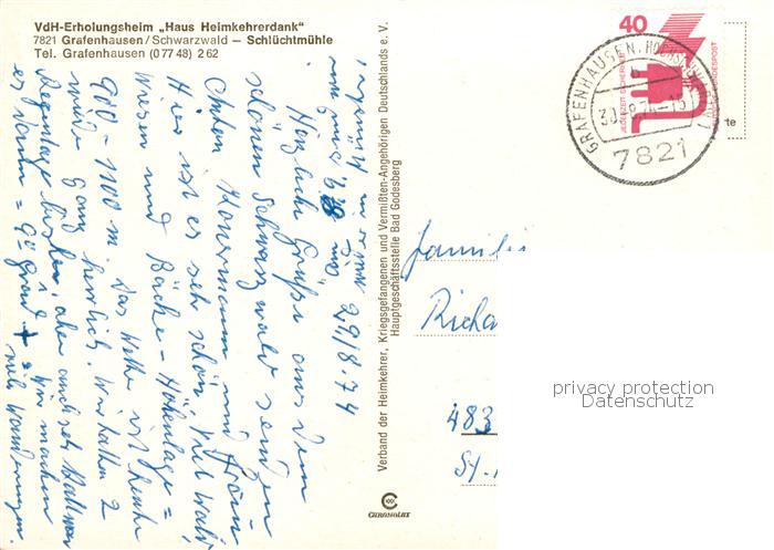 73858725 alte Postkarte Grafenhausen Schwarzwald VdH Erholungsheim Haus Heimkehrerdank Schluechtmuehle postalisch gelaufen Erhaltung siehe scans [WerneD78] KatCode: 11110008337039