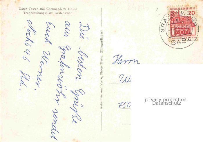 74049483 alte Postkarte Grafenwoehr Truppenuebungsplatz Water Tower and Commander’s House Wasserturm Kommandantur postalisch gelaufen Erhaltung siehe scans [FriedD77] KatCode: 11110009374124