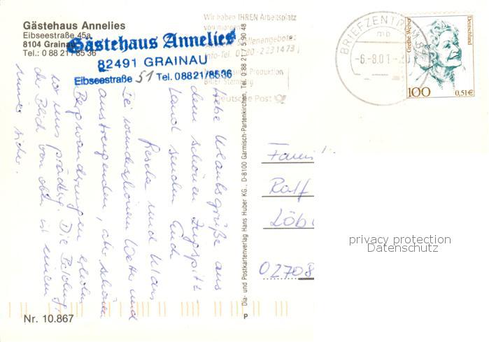 73790222 alte Postkarte Grainau Gaestehaus Annelies postalisch gelaufen Erhaltung siehe scans [FriedD77] KatCode: 11110009180118