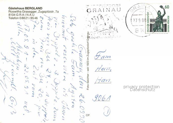 72617435 alte Postkarte Grainau Gaestehaus Bergland Gaststube Garten postalisch gelaufen Erhaltung siehe scans [WerneD78] KatCode: 11110009180118