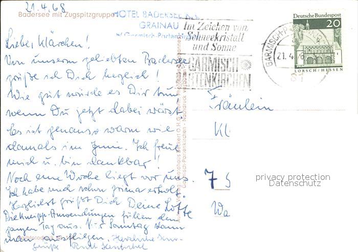 72413432 alte Postkarte Grainau Hotel Baedersee mit Zugspitzgruppe postalisch gelaufen Erhaltung siehe scans KatCode: 11110009180118
