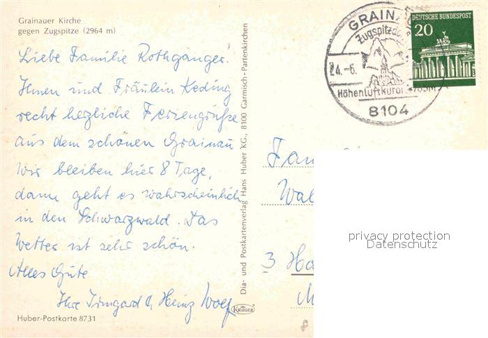 72775014 alte Postkarte Grainau Kirche Zugspitze postalisch gelaufen Erhaltung siehe scans [NatalD47] KatCode: 11110009180118