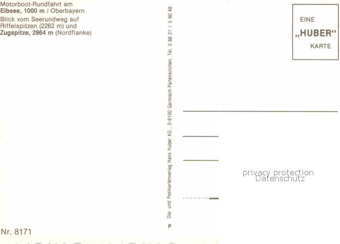 72722041 Grainau Motorboot Rundfahrt am Eibsee Seerundweg Riffelspitzen Zugspitze Wettersteingebirge Huber Karte Nr 8171 postalisch nicht gelaufen Erhaltung siehe scans [FriedD77] KatCode: 11110009180118