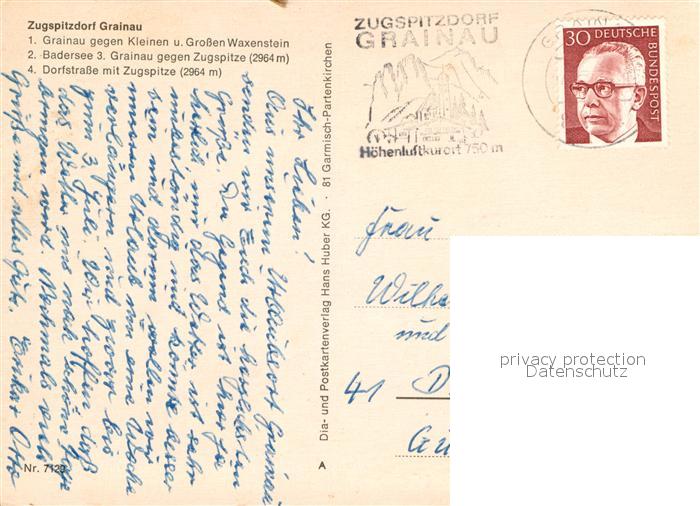 72929993 alte Postkarte Grainau Panorama mit Kl und Gr Waxenstein Badersee Zugspitze Dorfstrasse postalisch gelaufen Erhaltung siehe scans [WerneD78] KatCode: 11110009180118