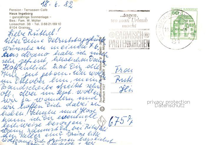 73791381 alte Postkarte Grainau Pension Terrasse Cafe Haus Ingeborg postalisch gelaufen Erhaltung siehe scans [WerneD78] KatCode: 11110009180118