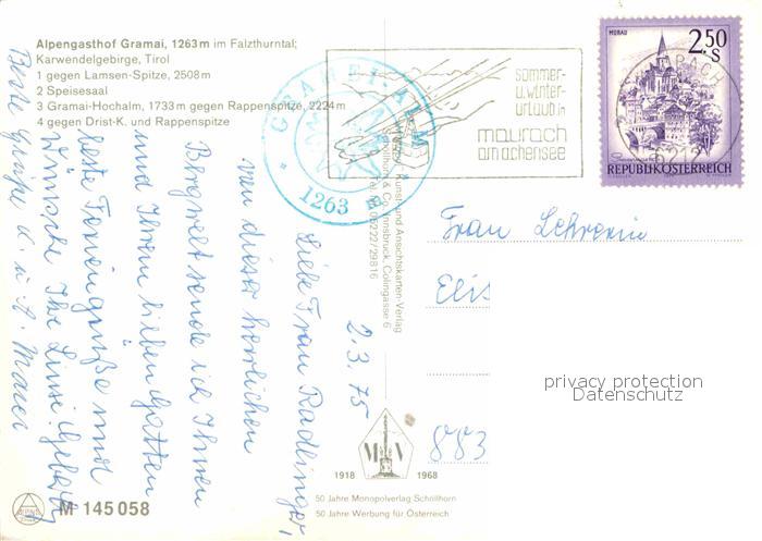 72679989 alte Postkarte Gramaialm Alpengasthof Gramai im Falzthurntal Lamsen-Spitze Speisesaal Rappenspitze postalisch gelaufen Erhaltung siehe scans [LiesaD40] KatCode: 11390335070907