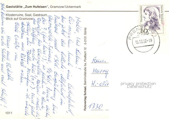 73642417 alte Postkarte Gramzow Uckermark Gaststaette Zum Hufeisen Saal Gastraum Klosterruine Partie am Fluss postalisch gelaufen Erhaltung siehe scans [FriedD77] KatCode: 11110012073225