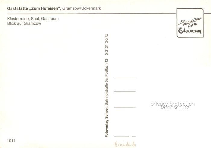 73659698 Gramzow Uckermark Gaststaette Zum Hufeisen Saal Gastraum Klosterruine Uferpartie am See postalisch nicht gelaufen Erhaltung siehe scans [FriedD77] KatCode: 11110012073225