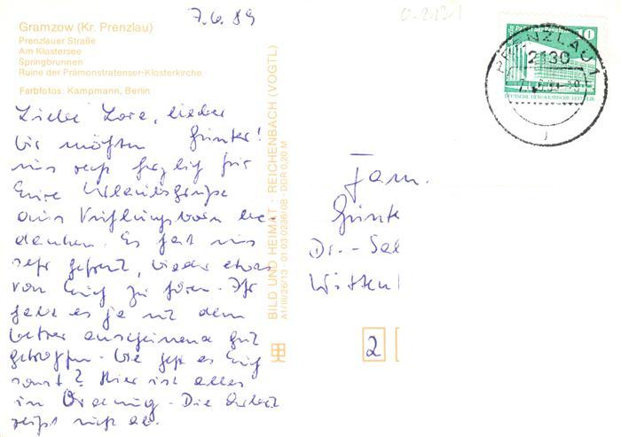 73946851 alte Postkarte Gramzow Uckermark Prenzlauer Strasse Am Klostersee Springbrunnen Ruine der Praemonstratenser Klosterkirche postalisch gelaufen Erhaltung siehe scans [WerneD78] KatCode: 11110012073225