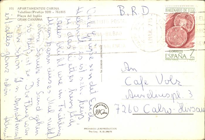old postcard Gran Canaria Apartamentos Carina Playa del Ingles postalisch gelaufen Erhaltung siehe scans