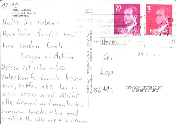 old postcard Gran Canaria Hotel Waikiki postalisch gelaufen Erhaltung siehe scans