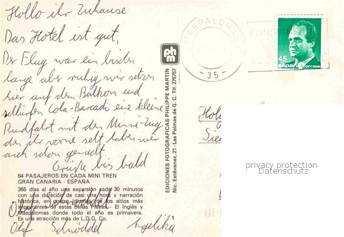 old postcard Gran Canaria Pasajeros en Cada Mini Tren postalisch gelaufen Erhaltung siehe scans [WerneD78]