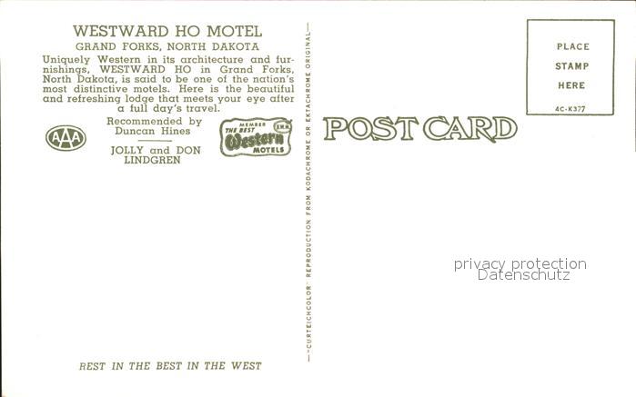 11688478 Grand Forks North Dakota Westward HO Motel postalisch nicht gelaufen Erhaltung siehe scans KatCode: 14140360000000