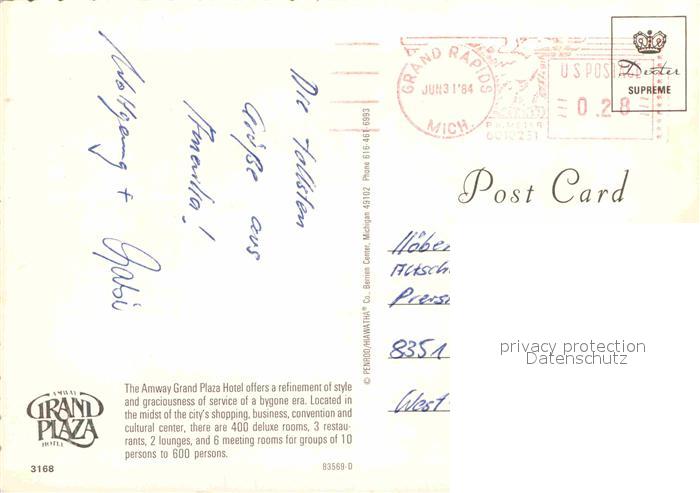 72901592 old postcard Grand Rapids Michigan Amway Grand Plaza Hotel postalisch gelaufen Erhaltung siehe scans [FriedD77] KatCode: 14140240000000