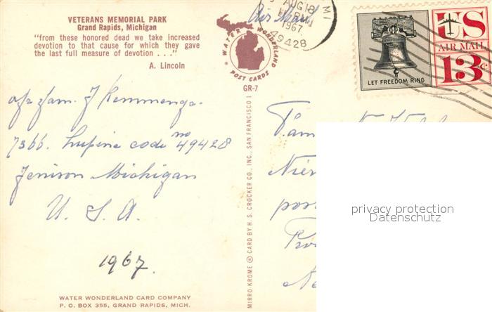 73060798 old postcard Grand Rapids Michigan Veterans Memorial Park postalisch gelaufen Erhaltung siehe scans [WerneD78] KatCode: 14140240000000