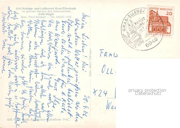 73854020 alte Postkarte Gras-Ellenbach Grasellenbach Cafe Huegel Kneipp- und Luftkurort postalisch gelaufen Erhaltung siehe scans [FriedD77] KatCode: 11110006431009