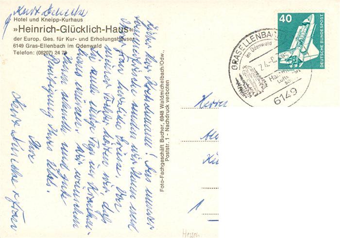 73884849 alte Postkarte Gras-Ellenbach Grasellenbach Hotel und Kneipp Kurhaus Heinrich Gluecklich Haus postalisch gelaufen Erhaltung siehe scans [WerneD78] KatCode: 11110006431009