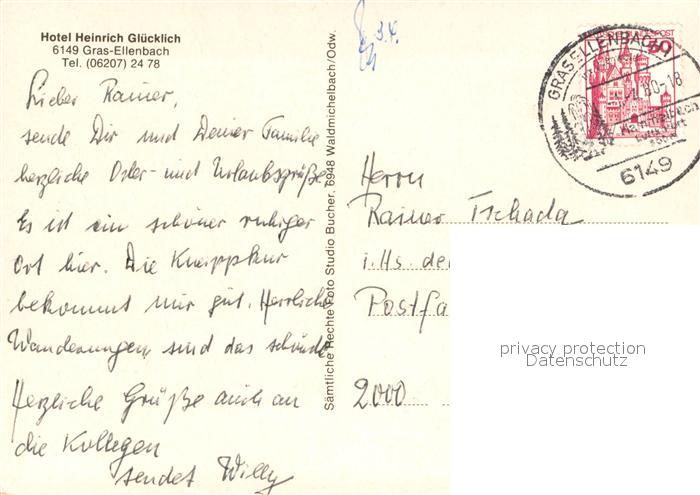 73642123 alte Postkarte Gras-Ellenbach Hotel Heinrich Gluecklich Kneipp Heilbad Speisesaal Foyer Badesee postalisch gelaufen Erhaltung siehe scans [WerneD78] KatCode: 11110006431009