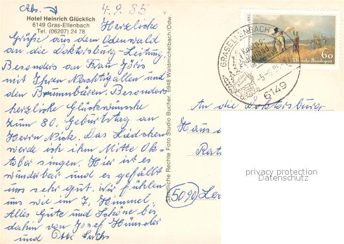 73730641 alte Postkarte Gras-Ellenbach Hotel Heinrich Gluecklich Kneipp-Heilbad postalisch gelaufen Erhaltung siehe scans [LiesaD40] KatCode: 11110006431009