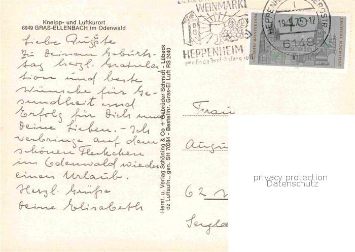 72800781 alte Postkarte Gras-Ellenbach Kneipp Luftkurort im Odenwald Fliegeraufnahme postalisch gelaufen Erhaltung siehe scans [FriedD77] KatCode: 11110006431009