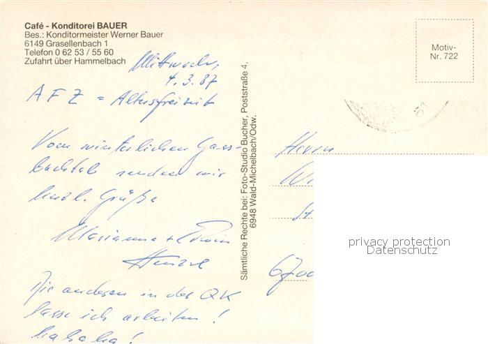 73784862 alte Postkarte Grasellenbach Cafe Konditorei Bauer postalisch gelaufen Erhaltung siehe scans [WerneD78] KatCode: 11110006431009