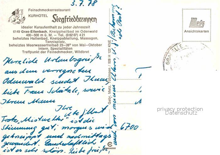 72724217 alte Postkarte Grasellenbach Kurhotel Siegfriedbrunnen Schwimmbad Kneippheilbad postalisch gelaufen Erhaltung siehe scans [FriedD77] KatCode: 11110006431009