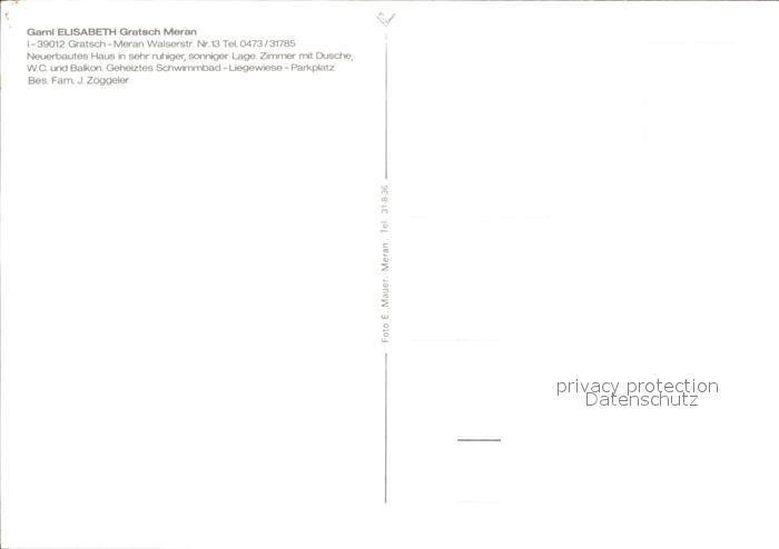 Gratsch Meran Hotel Garni Elisabeth mit Schwimmbad postalisch nicht gelaufen Erhaltung siehe scans
