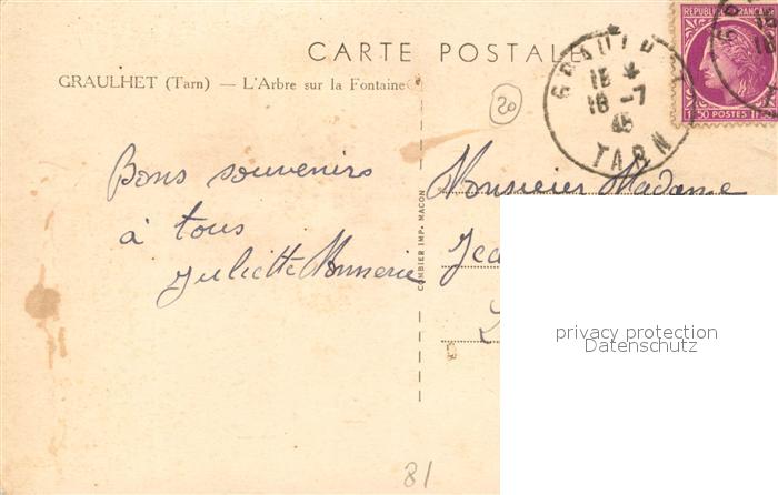 13485496 carte postale Graulhet Arbre sur la fontaine postalisch gelaufen Erhaltung siehe scans [FriedD77] KatCode: 11170081281105