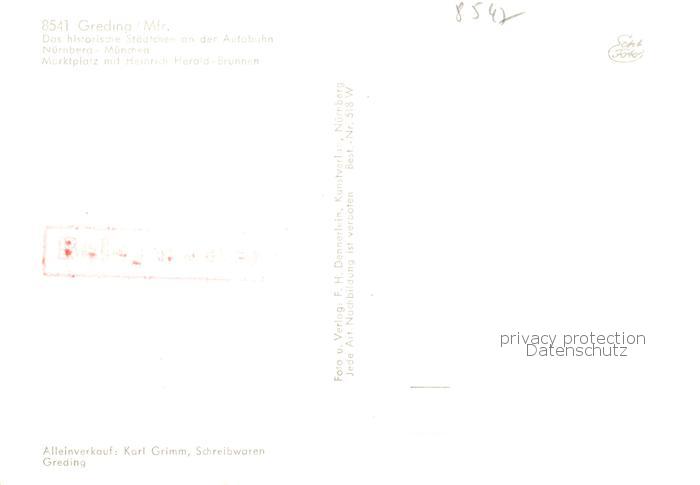 73830664 Greding Marktplatz mit Heinrich Herold Brunnen postalisch nicht gelaufen Erhaltung siehe scans [FriedD77] KatCode: 11110009576122