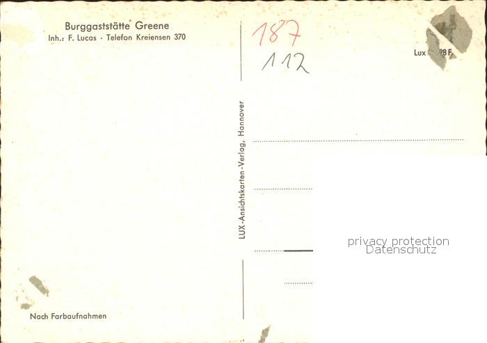 72156004 Greene Kreiensen Burggaststaette Greene im Leintal Wappen postalisch nicht gelaufen Erhaltung siehe scans KatCode: 11110003155008