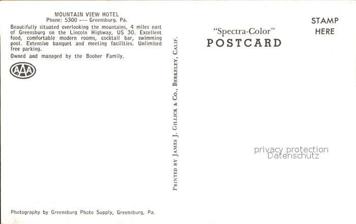 11688567 Greensburg Pennsylvania Mountain View Hotel postalisch nicht gelaufen Erhaltung siehe scans KatCode: 14140410000000