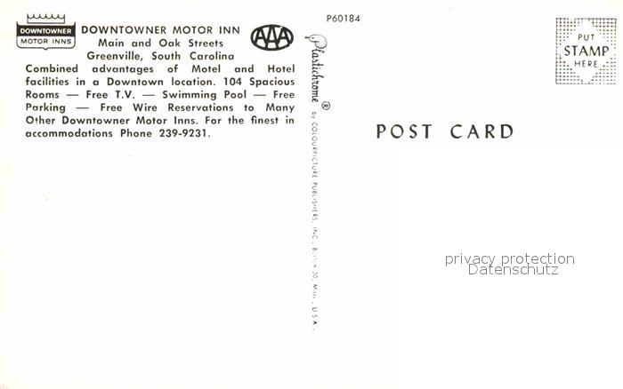 72812819 Greenville South Carolina Downtowner Motor Inn postalisch nicht gelaufen Erhaltung siehe scans [AndreD76] KatCode: 14140430000000