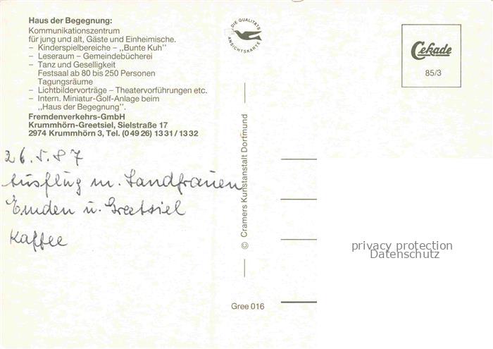 74150387 Greetsiel Krummhoern Aurich Niedersachsen Haus der Begegnung Kinderspielbereich Bunte Kuh Leseraum Gemeindebuecherei Festsaal postalisch nicht gelaufen Erhaltung siehe scans [WerneD78] KatCode: 11110003452014
