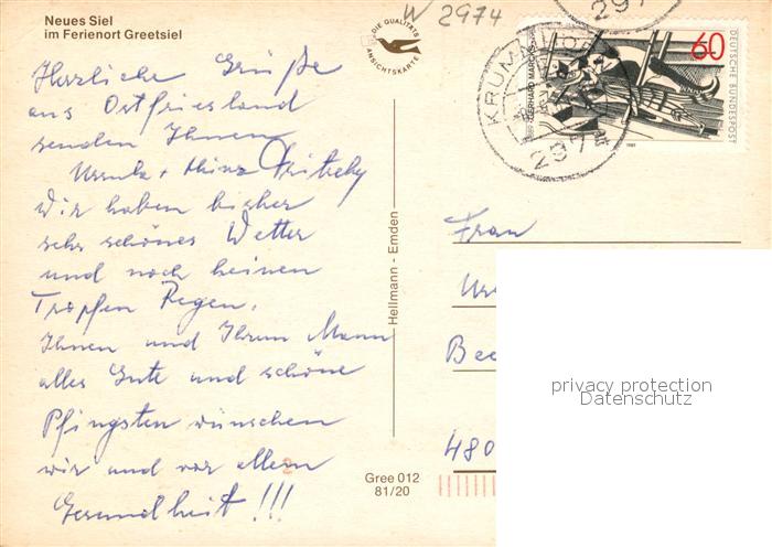 73084087 alte Postkarte Greetsiel Neues Siel postalisch gelaufen Erhaltung siehe scans [KathaD81] KatCode: 11110003452014