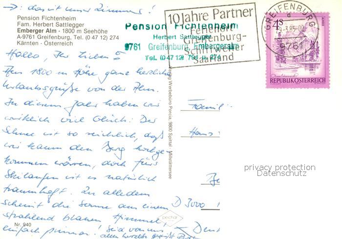 13223736 alte Postkarte Greifenburg Pension Fichtenheim Herbert Sattlegger postalisch gelaufen Erhaltung siehe scans [LiesaD40] KatCode: 11390212020609