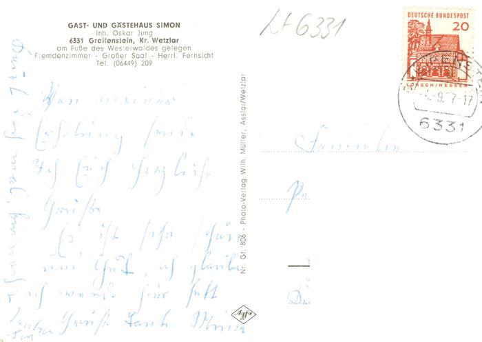 73869853 alte Postkarte Greifenstein Wetzlar Hessen Gast und Gaestehaus Simon postalisch gelaufen Erhaltung siehe scans [FriedD77] KatCode: 11110006532010