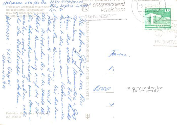 73574318 alte Postkarte Greifensteine Erzgebirge Greifensteingebiet Freibad Stauweiher Berggaststaette Greifenbachstauweiher Naturtheater postalisch gelaufen Erhaltung siehe scans [FriedD77] KatCode: 11110014171080