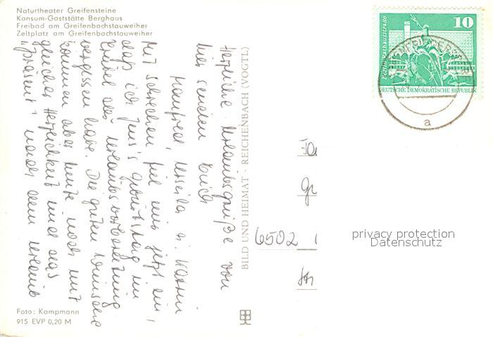 72950749 alte Postkarte Greifensteine Erzgebirge Naturtheater Konsum Gaststaette Berghaus Freibad und Zeltplatz am Greifenbachstauweiher postalisch gelaufen Erhaltung siehe scans [WerneD78] KatCode: 11110014171080
