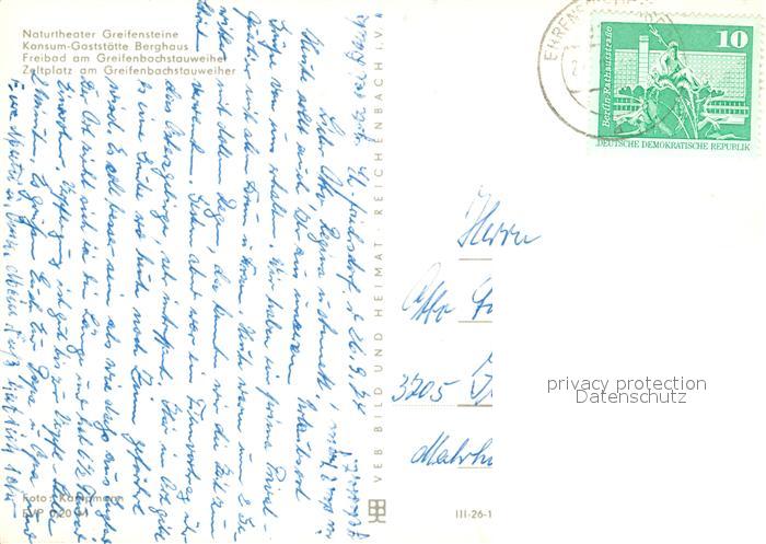 73062304 alte Postkarte Greifensteine Erzgebirge Naturtheater Konsumgaststaette Berghaus Freibad Greifenbachstauweiher Zeltplatz postalisch gelaufen Erhaltung siehe scans [FriedD77] KatCode: 11110014171080
