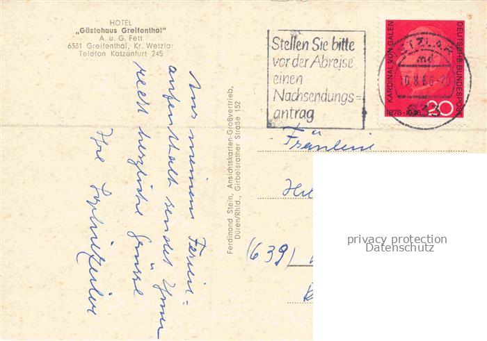 Greifenthal Hotel Gaestehaus Greifenthal postalisch gelaufen Erhaltung siehe scans [WerneD78] alte Postkarte Wern Katcode 11110006532008