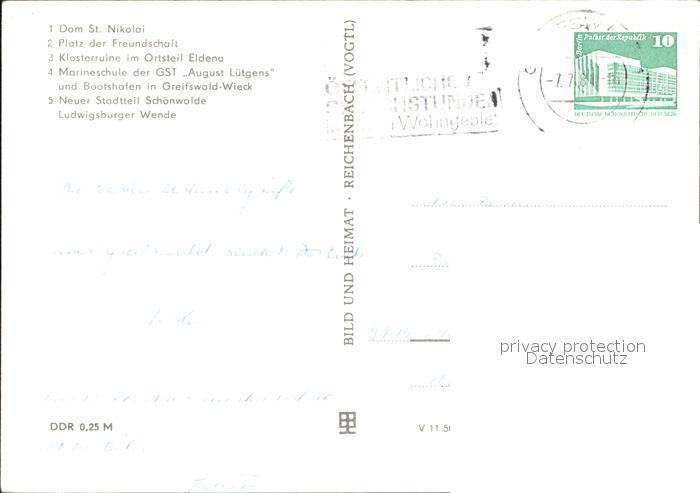 72476533 alte Postkarte Greifswald Dom Sankt Nikolai Platz der Freundschaft Klosterruine Marineschule postalisch gelaufen Erhaltung siehe scans KatCode: 11110013001000