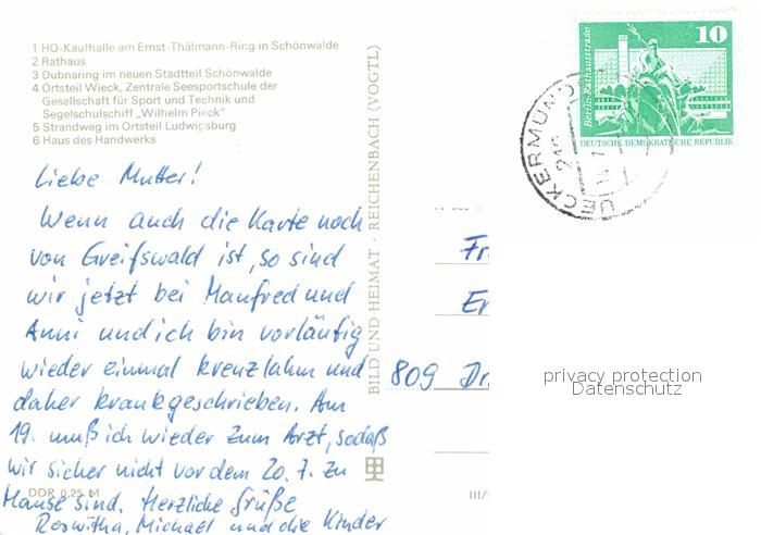 72647436 alte Postkarte Greifswald Dubnaring in Schoenwalde Seesportschule Ludwigsburg postalisch gelaufen Erhaltung siehe scans [LiesaD40] KatCode: 11110013001000