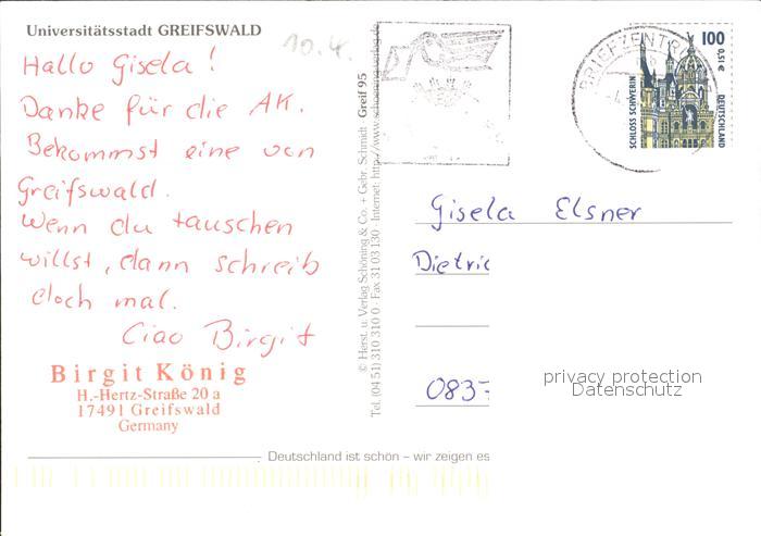 72336038 alte Postkarte Greifswald Mecklenburg Vorpommern Marienkirche Hafen Ryck Marktplatz Universitaet Brueckstrasse postalisch gelaufen Erhaltung siehe scans KatCode: 11110013001000