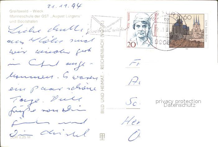 72068069 alte Postkarte Greifswald Mecklenburg Vorpommern Marineschule der GST August Luetgens Bootshafen Fliegeraufnahme postalisch gelaufen Erhaltung siehe scans KatCode: 11110013001000