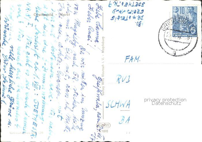 72115895 alte Postkarte Greifswald Mecklenburg Vorpommern Markt postalisch gelaufen Erhaltung siehe scans KatCode: 11110013001000
