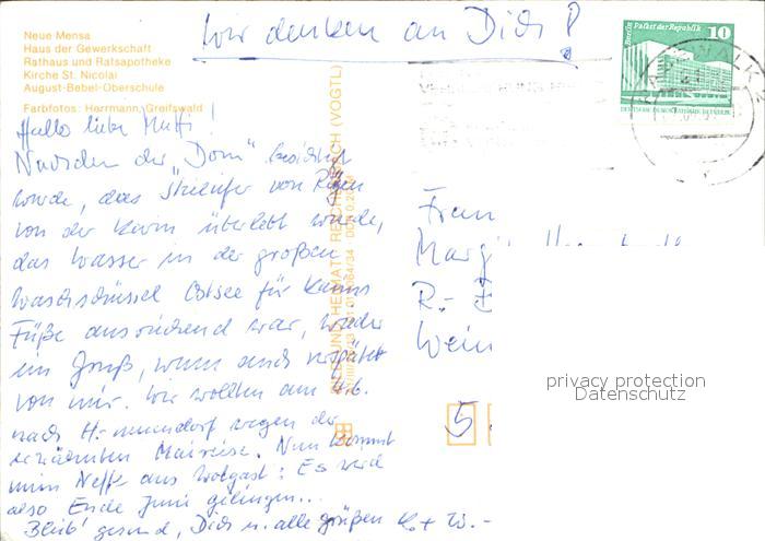 72135989 alte Postkarte Greifswald Mecklenburg Vorpommern Mensa Haus der Gewerkschaft Rathaus Ratsapotheke Kirche Oberschule Wappen postalisch gelaufen Erhaltung siehe scans KatCode: 11110013001000